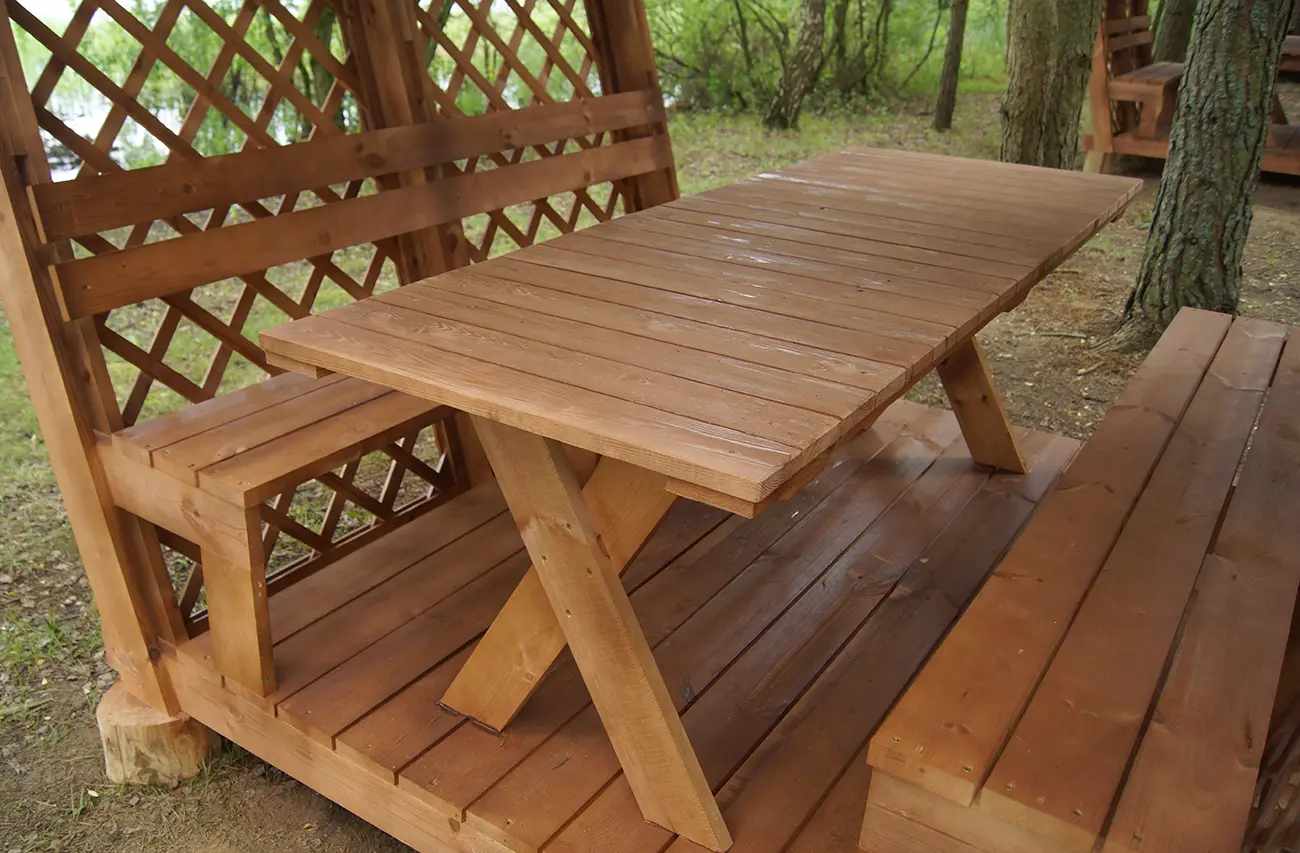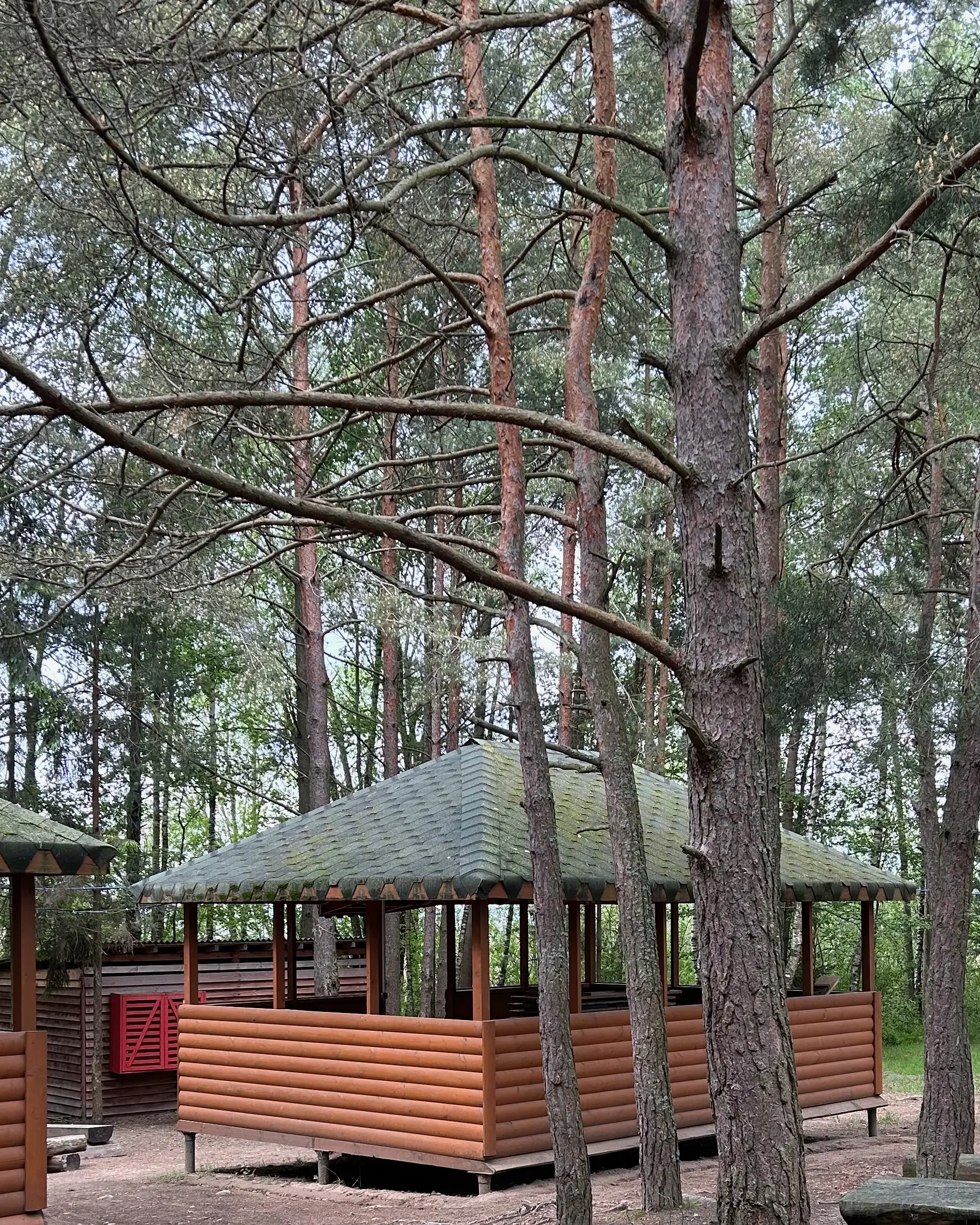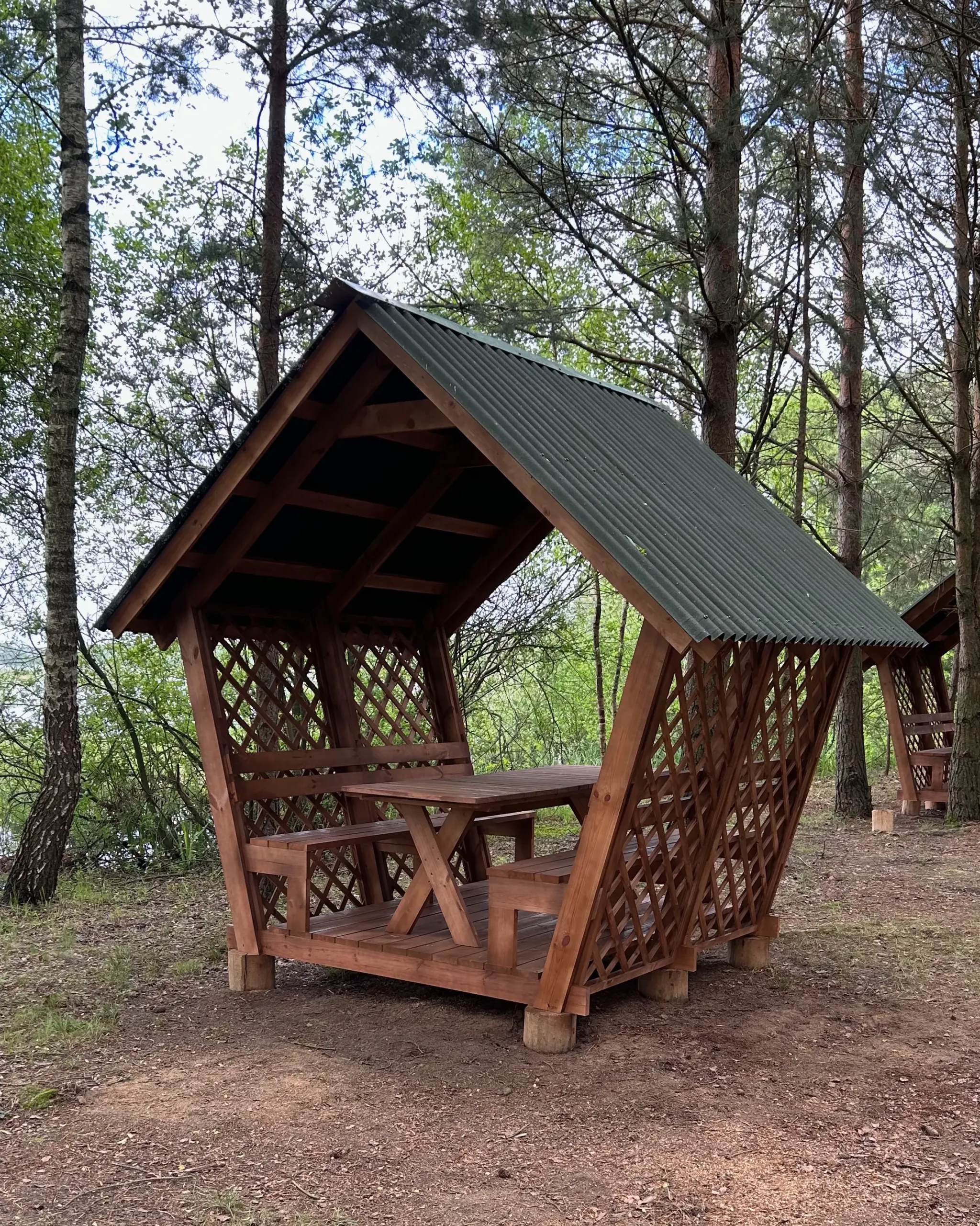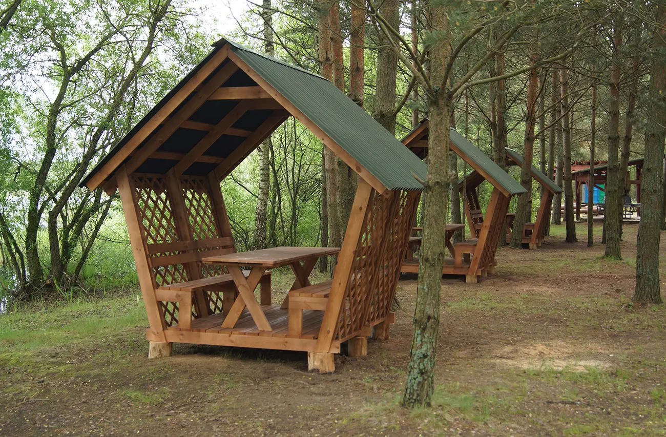 Беседки выполнены из натурального дерева. Они эстетично интегрированы в пространство кемпинга и словно впитывает в себя лесной воздух, наполняя беседку особым теплом и аутентичностью. Каждая беседка оборудована удобными лавочками и просторным столом: здесь комфортно разместиться и неспешно наслаждаться едой и разговорами.