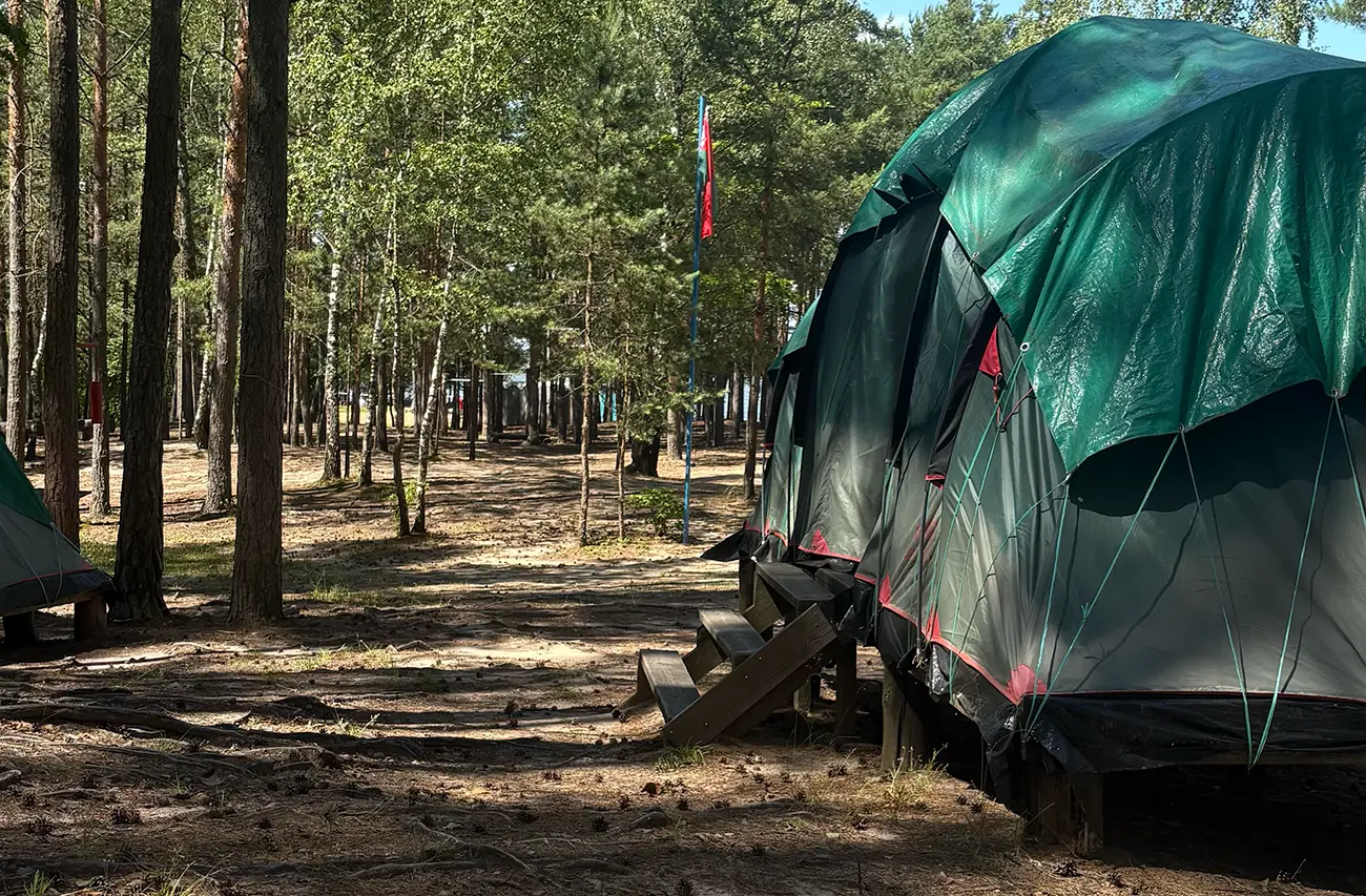 Каждому арендатору палатки мы дарим приятный бонусбесплатное пользование мангалом. Не нужно везти тяжелую конструкцию, искать кирпичи или собирать камни для костра. Все уже есть: обустроенное кострище и дрова. Вам остается просто готовить и наслаждаться отдыхом на природе. И это в самом сердце соснового леса и на живописном берегу Вилейского водохранилища. Из палаток открывается панорамный вид, потрясающие рассветы и закаты. И, конечно, с палаткой вы получаете весь функционал кемпинга:
