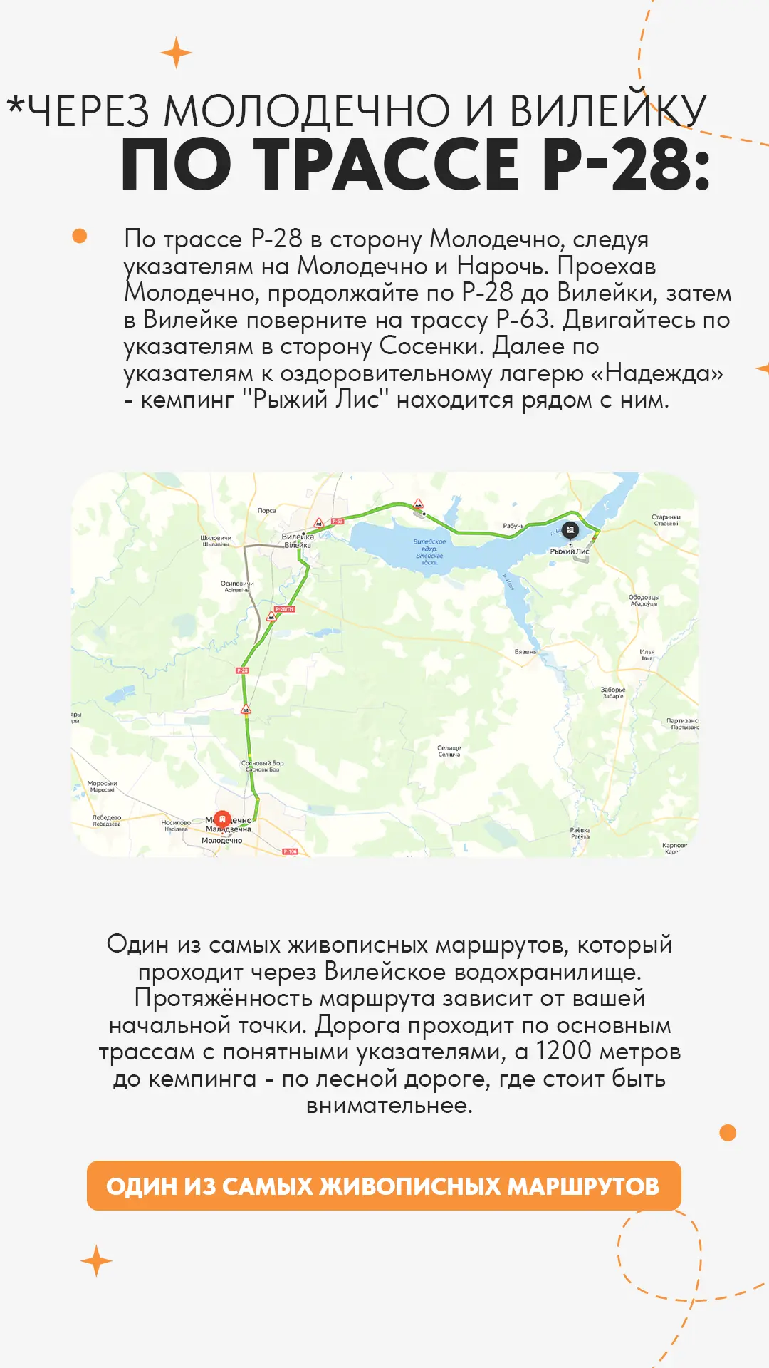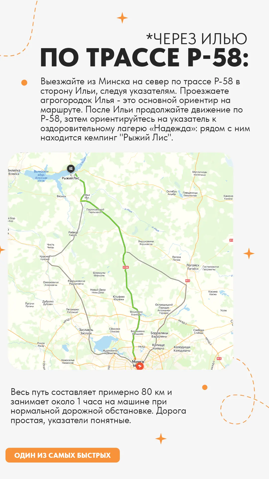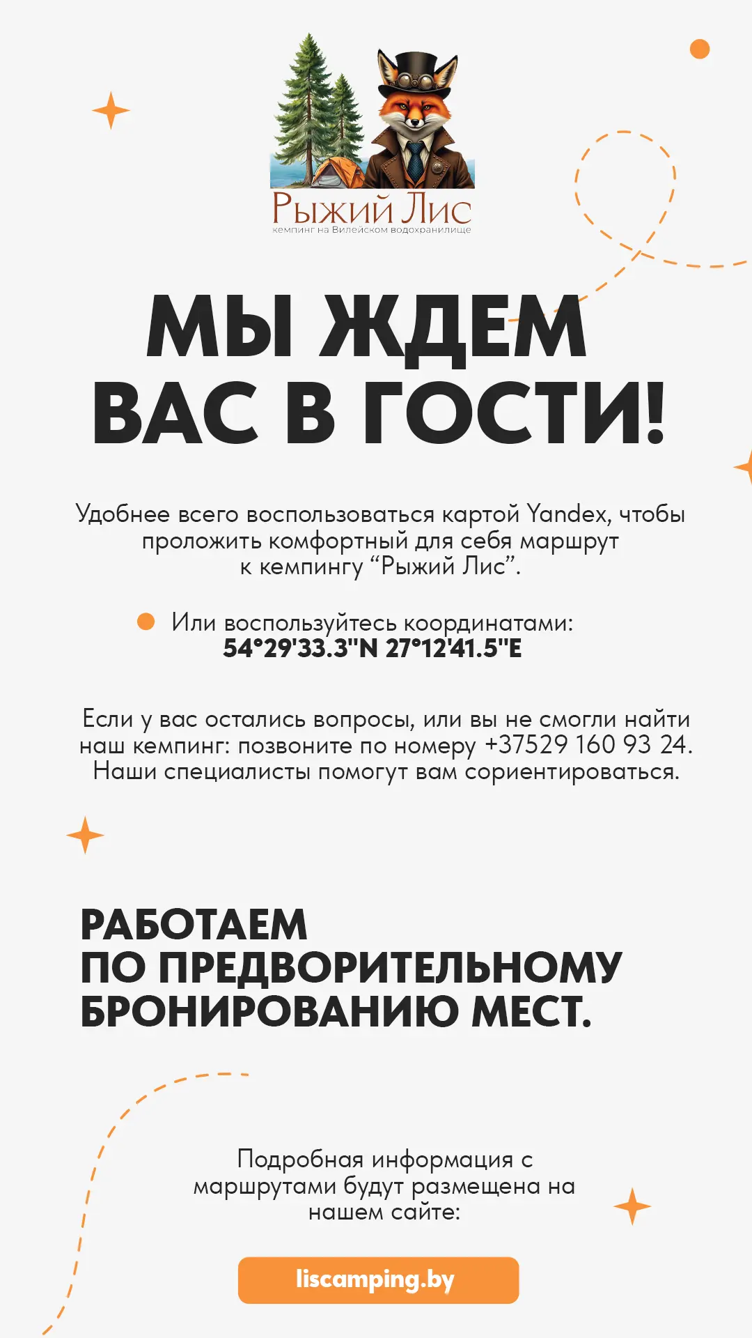 Мы позаботились о том, чтобы путь к нам был простым, удобным и приятным. Даже если вы не бывалый путешественник, не переживайте - подъездные пути к «Рыжему Лису» отличные: дороги ровные, а навигатор не запутается! Для тех, кто любит ориентироваться по старинке (или просто не доверяет гаджетам), мы установили яркие указатели на основных дорогах, так что мимо точно не проедете.