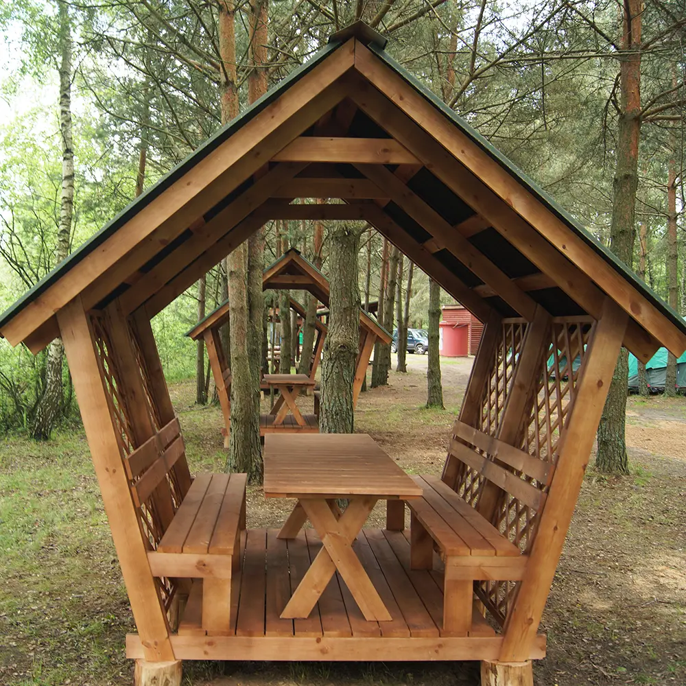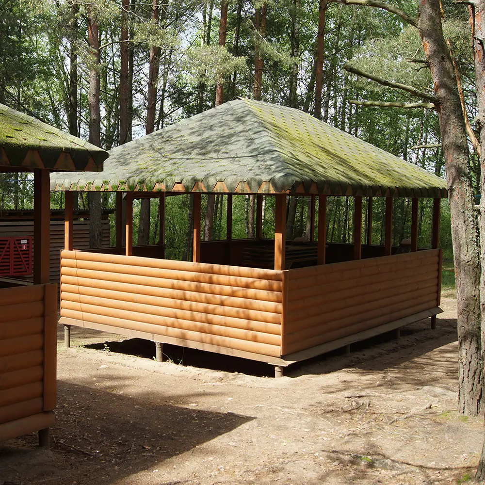 В нашем кемпинге вы можете арендовать два вида беседок: компактную (до 8 человек) и большую (до 20 человек) с кострищем: